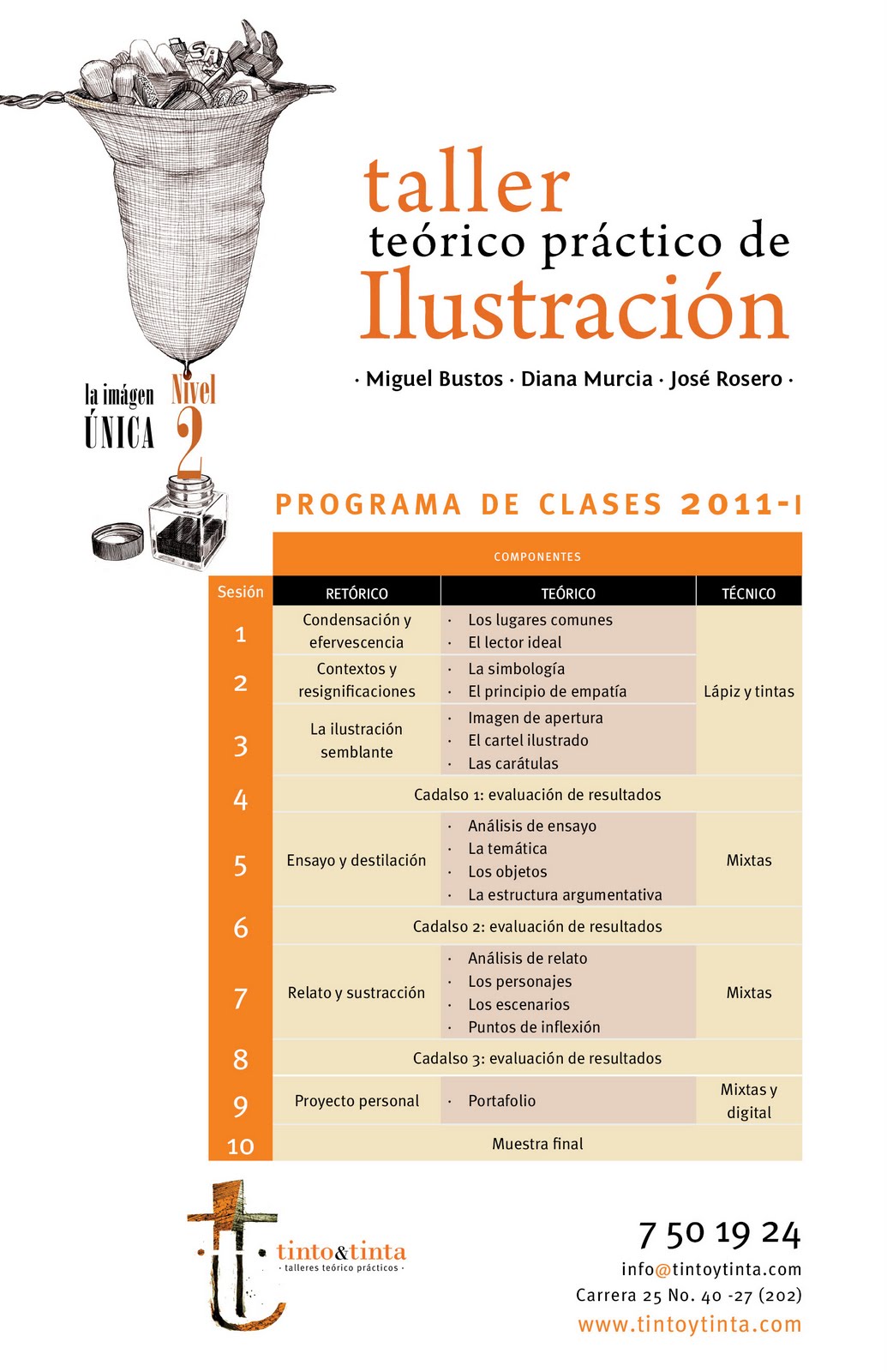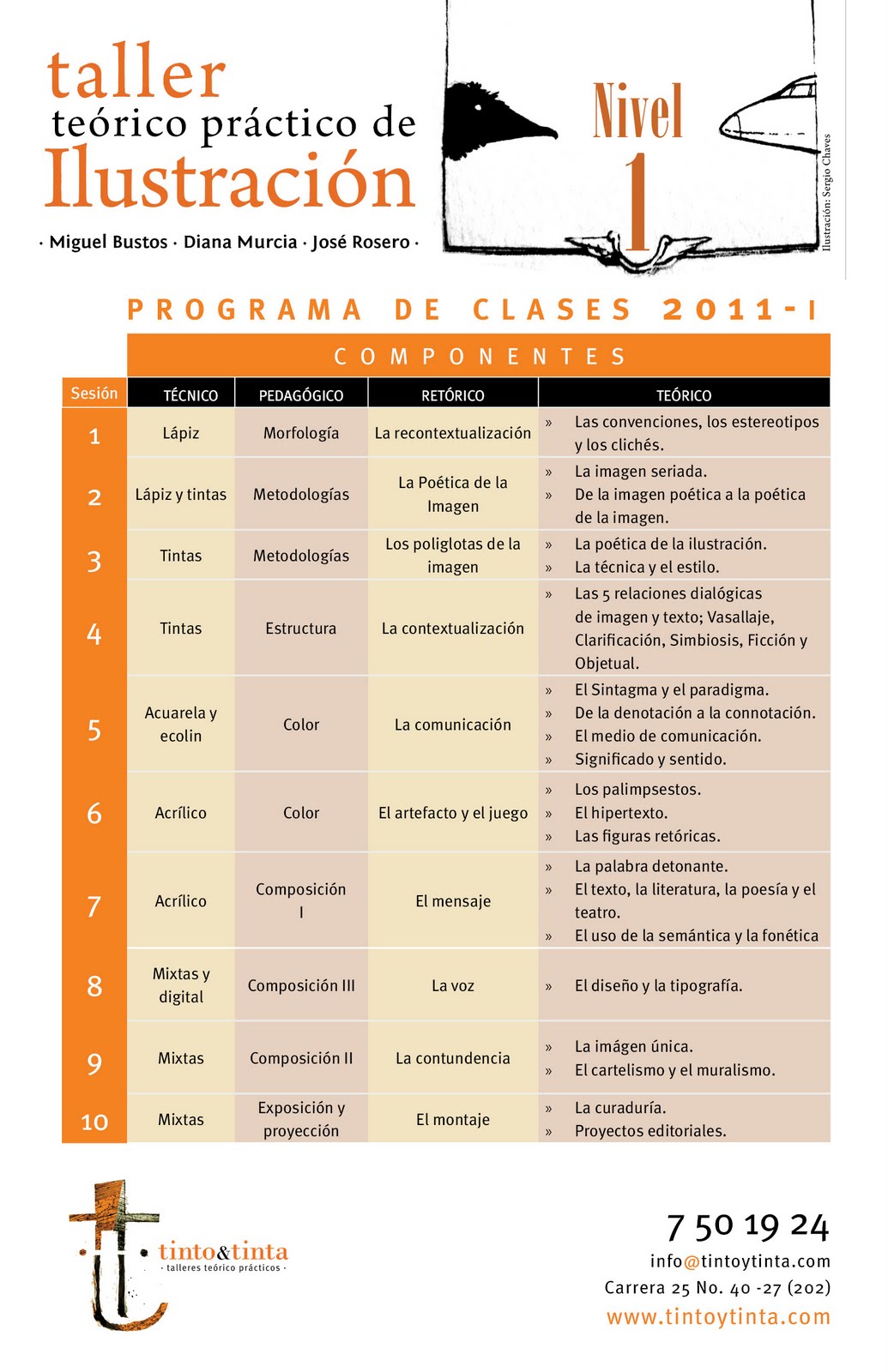 Talleres. Los amigos colombianos de tinto & tinta invitan a su programa teórico-práctico de ilustración para este primer trimestre del 2011, presentan su programa Nivel 1 y Nivel 2 con buenos ponentes como: Miguel Bustos, Diana Murcia y José Rosero. Tuve el gusto y la fortuna de conocer a José en la FIL de Guadalajara y me sorprendió su talento y su compromiso con el trabajo de la difusión del libro y la ilustración iberoamericana. Para los que viven en Bogotá o andarán por alla pronto, no les pierdan la pista. Mucho éxito muchachos.