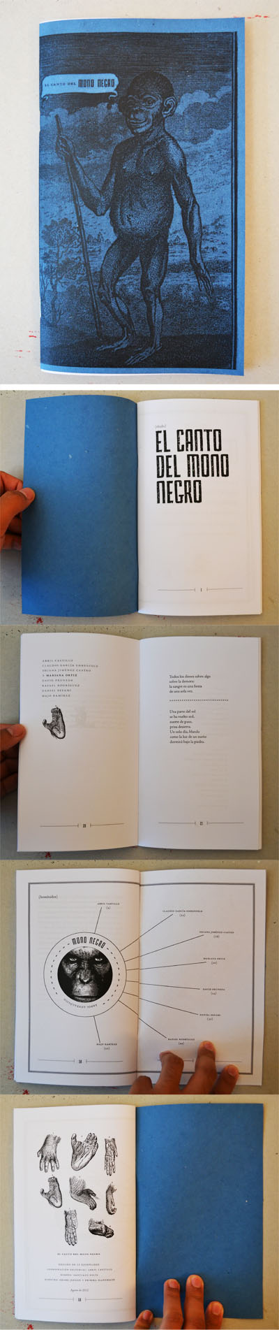 Tuve el gusto de diseñar este fanzine/libro/memoria/conmemorativo, que recopila los textos compuestos, aumentados o corregidos del colectivo literario El mono negro. Hicimos un tiraje casero de 10 ejemplares, de uso exclusivo del colectivo, sin fines de lucro. Yo por suerte les robe uno a esos monos enramados. La coordinación editorial estuvo a cargo de la maestra Abril Castillo. Siempre son emocionantes estos proyectos rápidos, compaginando e imprimiendo en fotocopias.