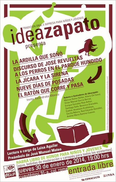 Presentación. De 5 libros del sello Ideazapato: La ardilla que soñó, Discurso de José Revueltas a los perros en el Parque Hundido, La jícara y la sirena, Nueve días de Posadas, El ratón que corre y pasa… el jueves 30 de enero de 2014 a las 19:00 horas.