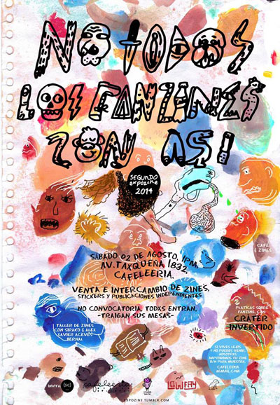Segundo Expozine, No todos los fanzines zon así, el sábado 2 de agosto a las 13:00 horas. Venta e intercambio de zines: “No + convocatoria, No + amiguismos, No + mamadas”. Además habrá: Taller de zines por Sirako Suflé y Alex Xavier Aceves Bernal, y una charla con Cráter Invertido.
